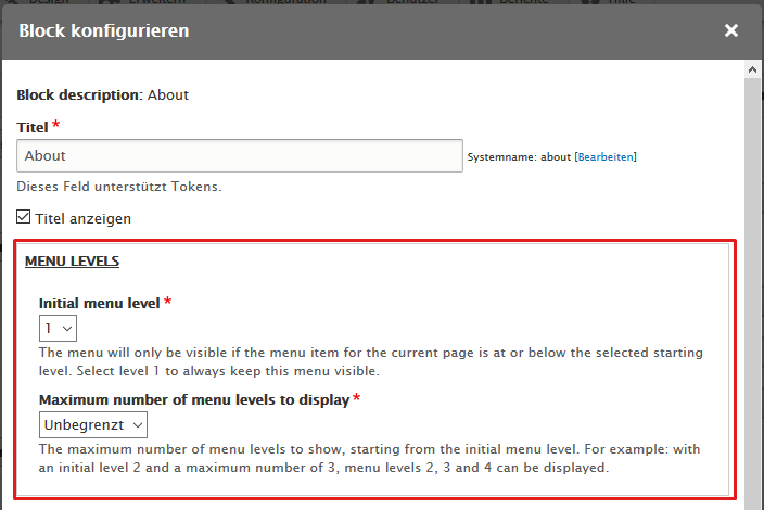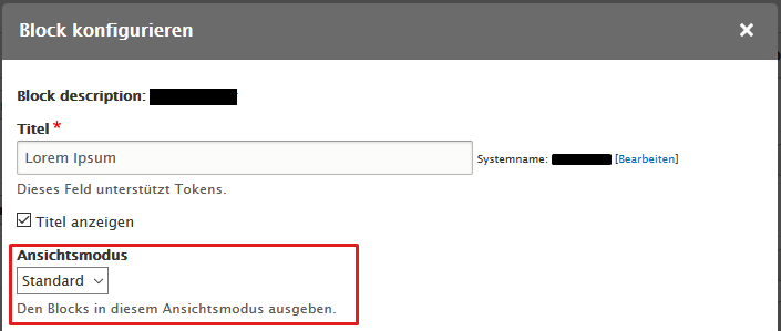 Bei der Block-Platzierung kann man für diese Blöcke nur einstellen, ob und wenn ja welchen Titel der Block tragen soll, und in welchem View Mode er ausgespielt werden soll.